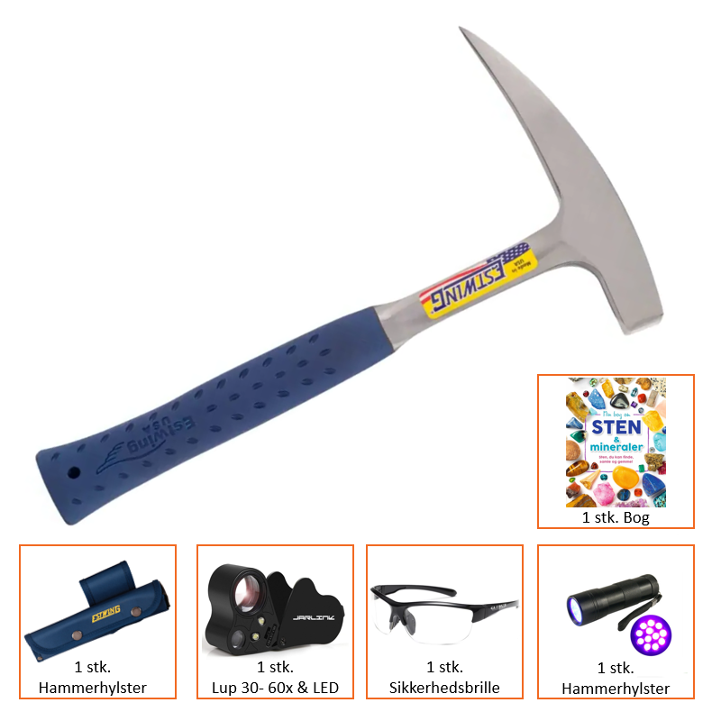 Sættet kommer med den klassiske geolog hammer fra mærket Estwing med et hammerhoved på 390g og en længde på 33cm. Hammeren har et elastisk vinyl skafte, og er dobbelt hærdet for at opnå ekstra styrke. Hammeren er desuden meget komfortabel at anvende og har en utrolig god holdbarhed. Hammerhovedet og skaftet er desuden smedet i ét stykke og består af et blankpoleret hoved.