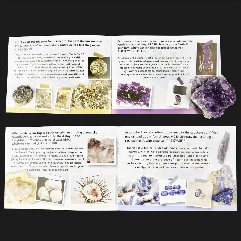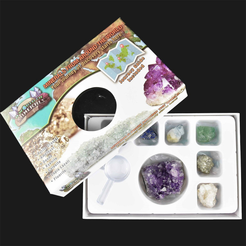 Hver pakke indeholder 7 forskellige Krystaller, 1 stor krystal og 6 små. inkl. lup og lille hæfte der fortæller om de forskellige typer.