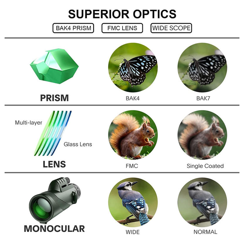 F2 leveres komplet med håndledsrem, opbevaringsetui, mikrofiberklud, mini Tripod, samt en smartphone adapter, så du kan tilkoble din smartphone direkte på monokikkerten - perfekt til at tage billeder af objekter, som du normalt ikke vil kunne komme i nærheden af.