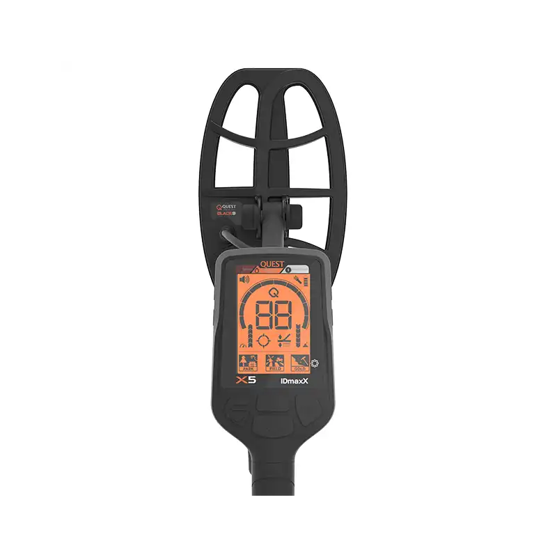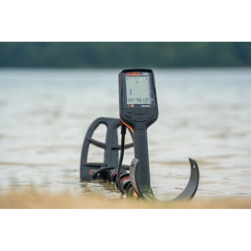 X5 IDmaxX er en let anvendelig og overskuelig detektor der ikke kræver teknisk viden, og derfor velegnet til alle typer brugere, unge som gamle, uerfarne eller øvede. Detektoren har alle nyeste og væsentlige funktioner som eksempelvis jerndiskrimination, Objekt identifikation, pinpoint funktion, LED lys, Orange baggrundsbelysning med mere. Det innovative design på Quest IDmaxX metal detektoren er 100% vandtæt, så man sagtens kan detekte i regnvejr eller sågar søge under vand ved strand, åer og søer i dybder nedtil 3 meter. Den opgraderede version af X5 er udstyret med en nyudviklet Blade 9" DD søgespole der er endnu mere følsom overfor små genstande og ideel til alle typer miljøer, og med den smidige 24 cm ovale facon er den nem at manøvrere med, selv på små områder. Søgespolen måler 24 x 14 cm og vejer sammen med resten af detektoren blot 1,1 kg.