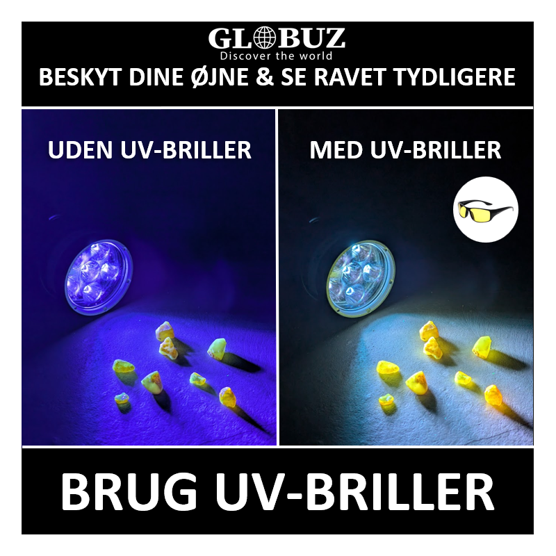 Beskyt dine øjne mod UV-lyset og se ravet endnu klarere. Vælg mellem almindelige UV-beskyttelsesbriller eller modeller til brillebrugere. 🔦