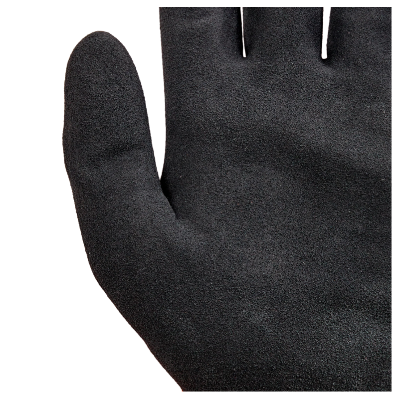 Handsken er sømløs strikket i polyester/akryl. Opbygningen er en foret strikhandske der er dyppet i naturgummi, og dermed gør den helt vand og vindtæt. Dertil har håndfladen fået en overflade af opskummet naturgummi og giver handsken en god solid gribe flade, så materialer ikke glider ud af hænder og fingre.