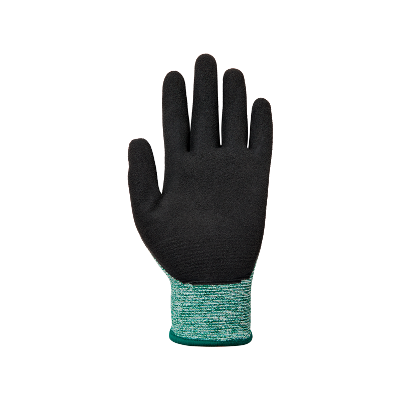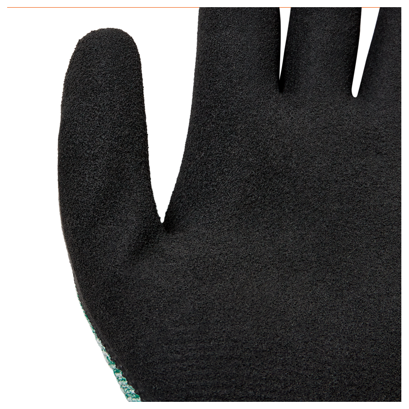 Handsken er lavet med Øko-Tex certificeret, sømløs nylon/spandex strik. Latex skumbelægning på håndfladen og fingerspidserne giver fremragende greb og fingerfærdighed. Håndfladen og håndleddene er lavet af polyester og elastan for en god pasform. Ribbet polyestermanchet med elastisk manchet for at forhindre handsken i at glide af.