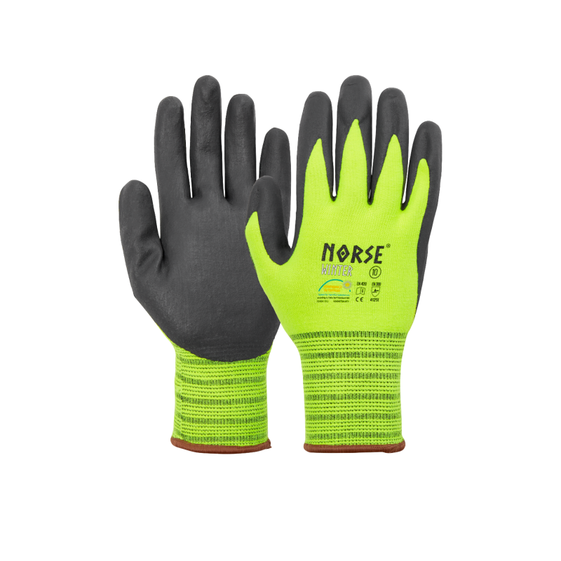 NORSE - WINTER er en tætsiddende, let vinterforet arbejdshandske, der sikrer at du har god føling med håndfladen og fingrene, samtidigt med du holder lidt på varmen. Perfekt hvor der kræves præcision med det objekt, man arbejder med. Den tætsiddende ribkrave bevirker, at handsken ikke glider af. En virkelig god overgangshandske med en bred vifte af anvendelses muligheder. Den er sømløs strikket i polyester med blød Latex-foam belægning, der sikre en behagelig pasform, uden trælse syninger. Handsken er halvdyppet og kommer med en ribsstrikkant af polyester med elastik. Handsken er herudover lavet i en high visibility farve, hvilket gør brugen mere synlig.