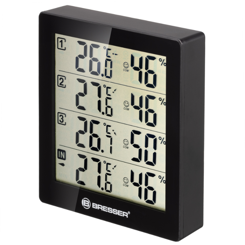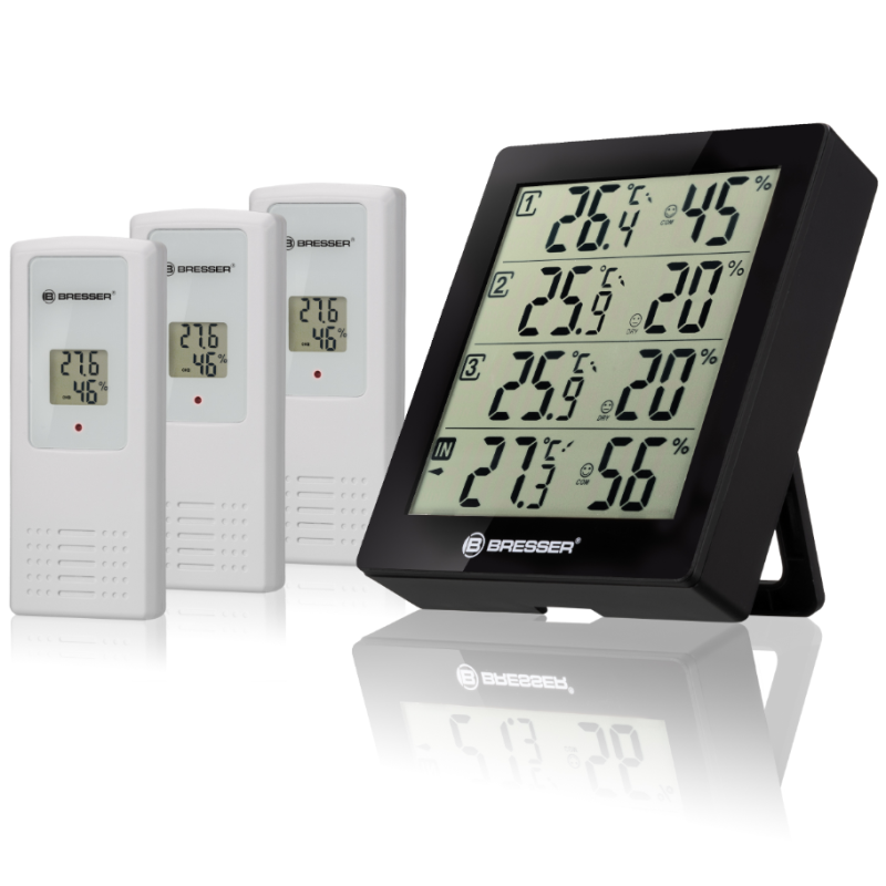 Er dit kælderrum for fugtigt og truet af skimmelsvamp? Er temperaturen i børneværelset i orden? Er det for varmt på terrassen? BRESSER Termo-/Hygrometer Quadro kan give dig svaret på dine spørgsmål. Stationen giver dig mulighed for at måle temperatur og luftfugtighed i eller omkring dit hus, på 4 forskellige steder med enkel overvågning, på ét sted.
